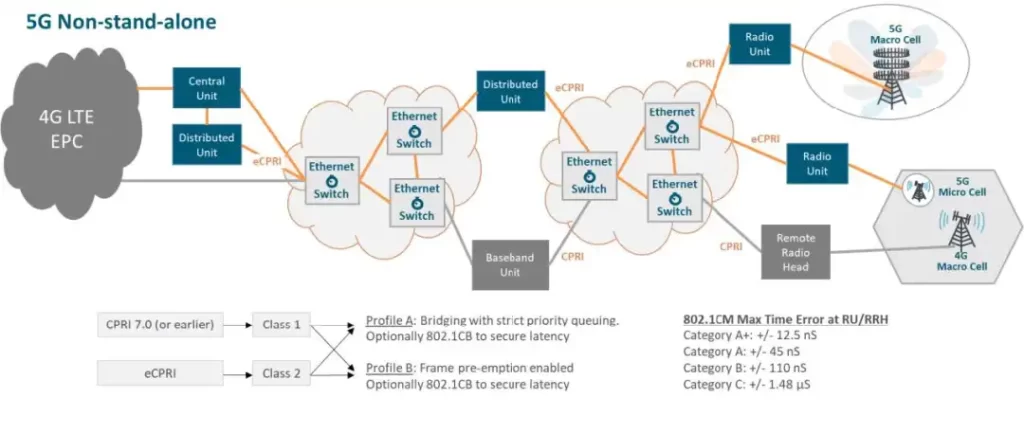 이동 통신 전송망(Fronthaul) 강화: O-RAN 구조에서 장비 간 긴밀한 협업을 위해 IEEE 802.1AS(정밀 시간 동기화)와 802.1Qbv(시간 인식 스케줄링)를 적용, 기지국이 정밀 시계처럼 동기화되도록 돕습니다.