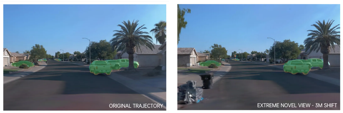 검증 결과를 통해 알 수 있듯이, 원본 궤적 시나리오에서는 도로 및 양측의 보이는 차량이 모두 녹색 영역으로 덮여 있어, 모델은 차폐물 없이 정상적인 시야에서 안정적으로 차량을 감지한다. 극단적인 새로운 시점(3미터 오프셋) 시나리오에서는 시점 변화로 인해 일부 환경 요소(예: 왼쪽 쓰레기통 등 새로운 물체)가 추가되었음에도 불구하고, 차량에 대한 녹색 감지 영역은 여전히 잘 유지되어, 모델의 시점 편향 상황에 대한 적응성을 입증한다. 또한, 대부분의 노란색 ‘오차’는 공개 모델이 목표 경계를 과도하게 확장(dilated)하여 예측하기 때문에 발생하며, 파란색 영역은 보통 차량이 부분적으로 가려지거나 거리가 멀어 aiSim이 인식하지 못할 때 나타났다.