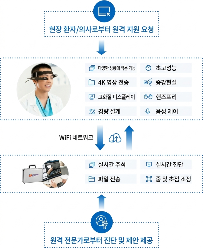 통합 AR 원격 의료 솔루션은 AR안경의 휴대성과 전문 영상 시스템의 정밀성을 결합하여 복잡한 수술과 원격 진료에 전방위적인 지원을 제공하며, 특히 실제 장면과 의료 영상을 동시에 참고해야 하는 상황에 적합합니다
