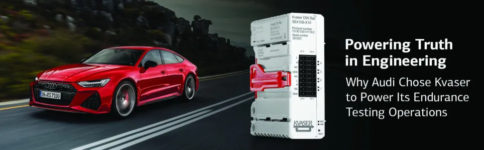 아우디의 네카르슐름(Neckarsulm) 및 잉골슈타트(Ingolstadt) 테스트 시설에서 Kvaser의 DIN 레일 SE400S-X10은 여러 개의 동력계(dynamometer)를 대상으로 24시간 내내(24/7) 테스트를 수행하며, 아우디의 테스트 차량으로부터 CAN/CAN-FD 데이터를 안정적으로 수집하는 것을 보장한다. RA Consulting의 DiagRA D 소프트웨어는 데이터를 종합하고, OEM별 진단 절차를 사용하여 데이터를 수집하고 문제를 해결한다. DiagRA D의 고급 개발자 기능과 Kvaser DIN 레일 모듈의 펌웨어 업데이트 기능을 통해, 이 시스템은 새로운 기능이 추가되거나 아우디의 진단 테스트 요구사항이 변경됨에 따라 함께 발전해 나갈 수 있다.。