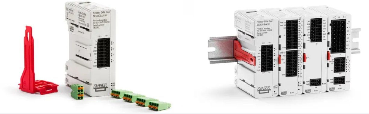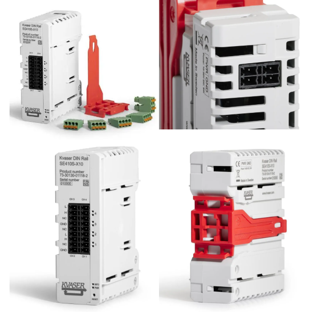 이것은 강력한 성능의 이더넷 to CAN FD 어댑터로, Kvaser t-script를 지원한다. 4개의 CAN/CAN F 채널과 16GB 플래시 메모리를 갖췄으며, 추가 모듈을 통해 I/O도 지원한다. Kvaser DIN 레일 SE410S-X10은 추가 모듈의 호스트 역할을한다. 외함에는 신속한 설치를 위한 클램프가 있어 DIN 레일에 쉽게 고정할 수 있다.